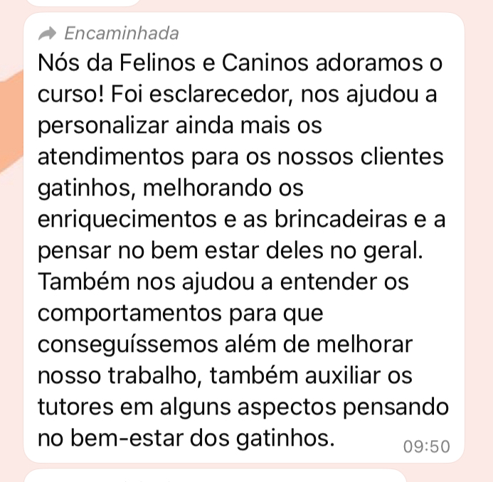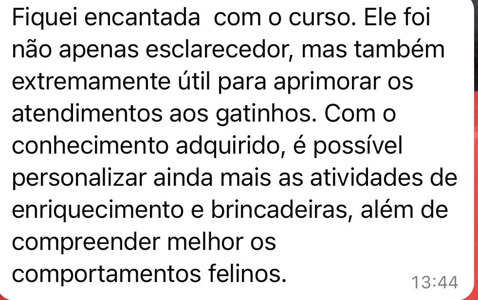 O distresse é um estado de estresse intenso e contínuo que compromete a saúde física e emocional dos gatos. Neste módulo extra, você vai aprender a: 🔍 Reconhecer os sinais mais sutis de distresse, como mudanças de comportamento, alterações alimentares e comportamentos compulsivos; 🧠 Compreender a origem desse desequilíbrio emocional, muitas vezes ligado à forma como o ambiente e a rotina estão estruturados; 🛠️ Aplicar pequenas mudanças práticas, baseadas na técnica MEMO, que transformam o bem-estar do gato — e a tranquilidade do tutor; 🗣️ Conduzir conversas conscientes com os tutores, oferecendo orientações que elevam o valor do seu atendimento como catsitter ou profissional da área felina. Esse bônus é um verdadeiro diferencial para quem quer atuar com excelência e consciência no cuidado dos gatos.